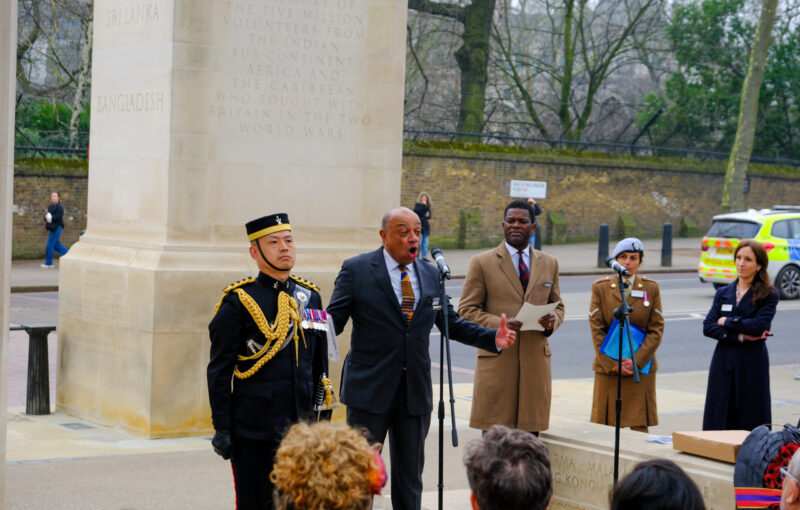 Those in attendance were greeted by The Rt Hon The Lord Boateng CVO, Chairman of the Memorial Gates Council. Following this, Sir Ben Okri delivered a moving poem, after which Brigadier (Retired) Justin Maciejewski DSO MBE presented a speech highlighting the sacrifices made by individuals from all Commonwealth nations during World War Two, emphasizing the significance of the Memorial Gates in commemorating our history in contemporary times.
